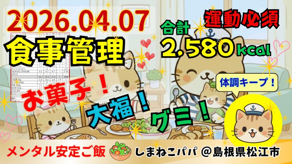 🐾しまねこパパの食事管理の記録📝2,580kcal🌱2026年4月7日