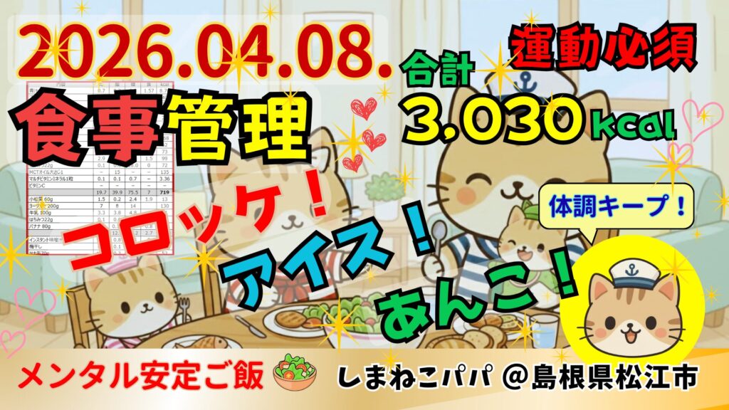 🐾しまねこパパの食事管理の記録📝3,030kcal🌱2026年4月8日