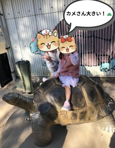 リクガメさんのコーナーでは模型のリクガメさんがいて、リクガメさんによじのぼってにっこりご満悦🐢