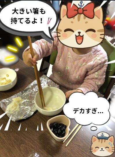 たまたまお母さんが菜箸を持っていたので、それを近くに置いていたら、大きい箸が良いということで菜箸を使ってお餅を食べ始める🥢