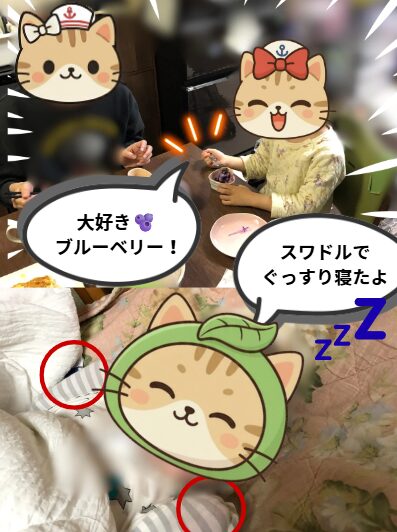 そんなお姉ちゃんを横目に、にゃん太はスワドルを着て朝までぐっすり10時間睡眠!💤