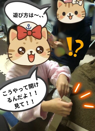 遊び方を確認するお母さんをよそ目に、自己流でどんどん開梱!笑