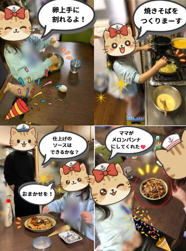 卵を上手に割って溶き卵を作って、焼きそばも混ぜ混ぜして、料理をするのがどんどん上手になって行くにゃん子ちゃん❤️