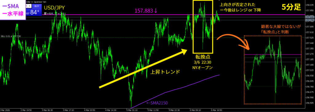 - 転換点:大陰線@3/6 22:30(上昇終了)