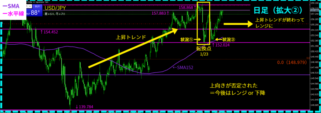 - 157.883辺りで「転換点(大陰線)」が出たので、今は日足のレンジの上値が157.883が効いている