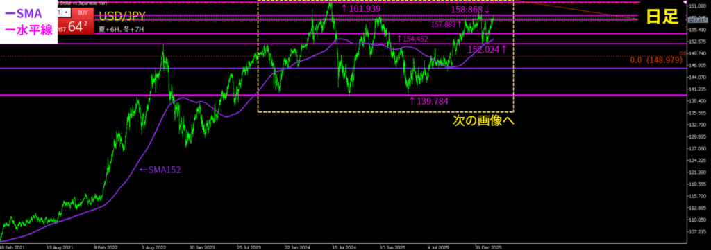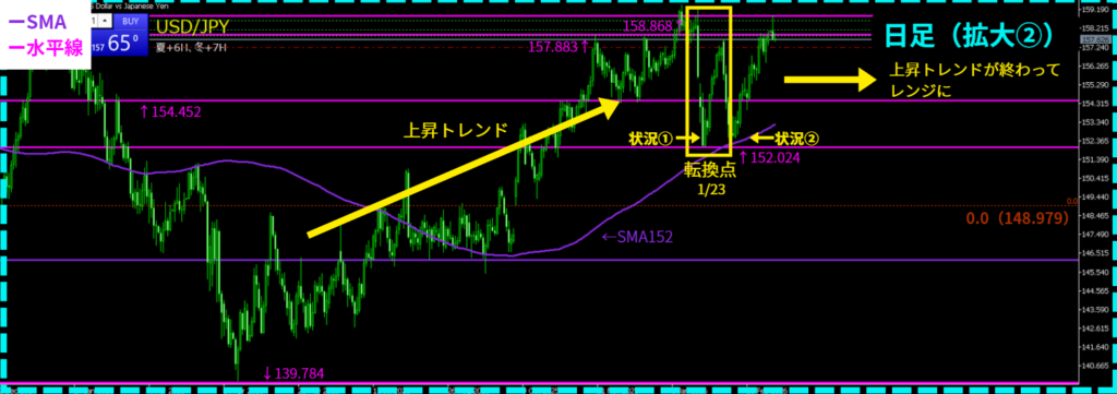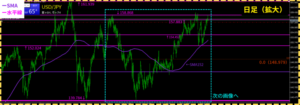 - 日足レンジ(上158.868↔下152.024)で、下から上に向かって値動きしている状況