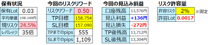 - 相場状況:レンジ(上158.868↔下152.024)