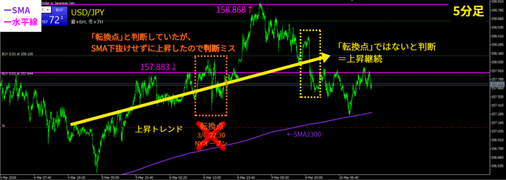 - 「転換点」が出たかどうか迷った時、「転換点」だと思った大線が出た後に、SMAを突き抜ける動きをしたら、それは大線が「転換点」だったという証拠になる