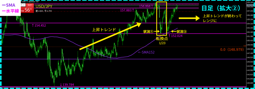 • 日足レンジ(上158.868↔下152.024)で、下から上に向かって値動きしている状況