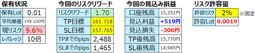 - 相場状況:レンジ(上158.868↔下152.024)