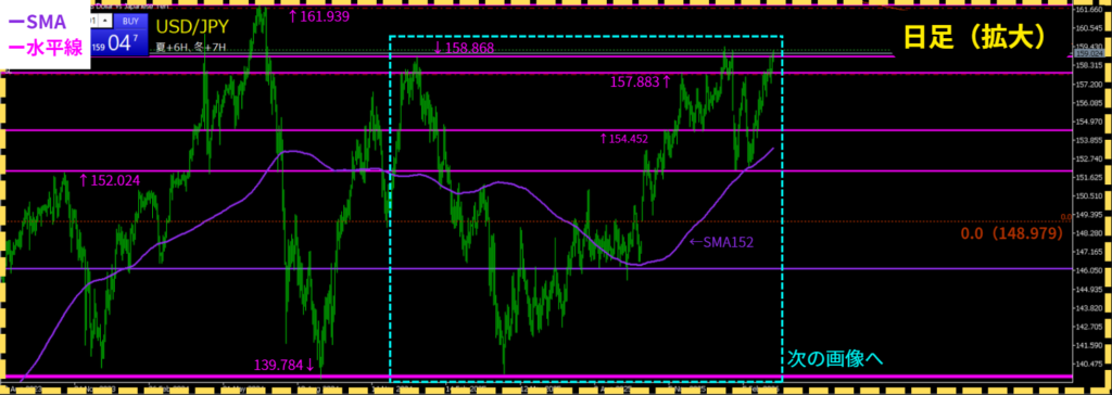- 日足レンジが継続するなら、158.868 or 161.939付近で「転換点(大陰線)」が出る※