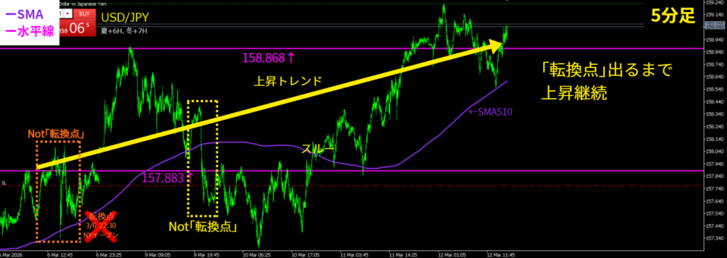 - 「転換点」が出たかどうか迷った時、「転換点」だと思った大線が出た後に、SMAを突き抜ける動きをしたら、それは大線が「転換点」だったという証拠になる