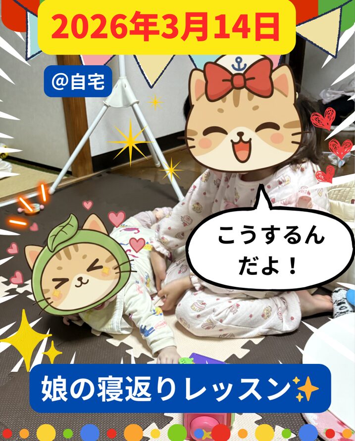 この前に寝転がってにゃん子が「こうやって寝返りするんだよ」と言って寝返りの見本を見せてくれたりしていて、とても優しいお姉ちゃんだなあと子供たちを見ていてとても嬉しい気持ちになった💕
