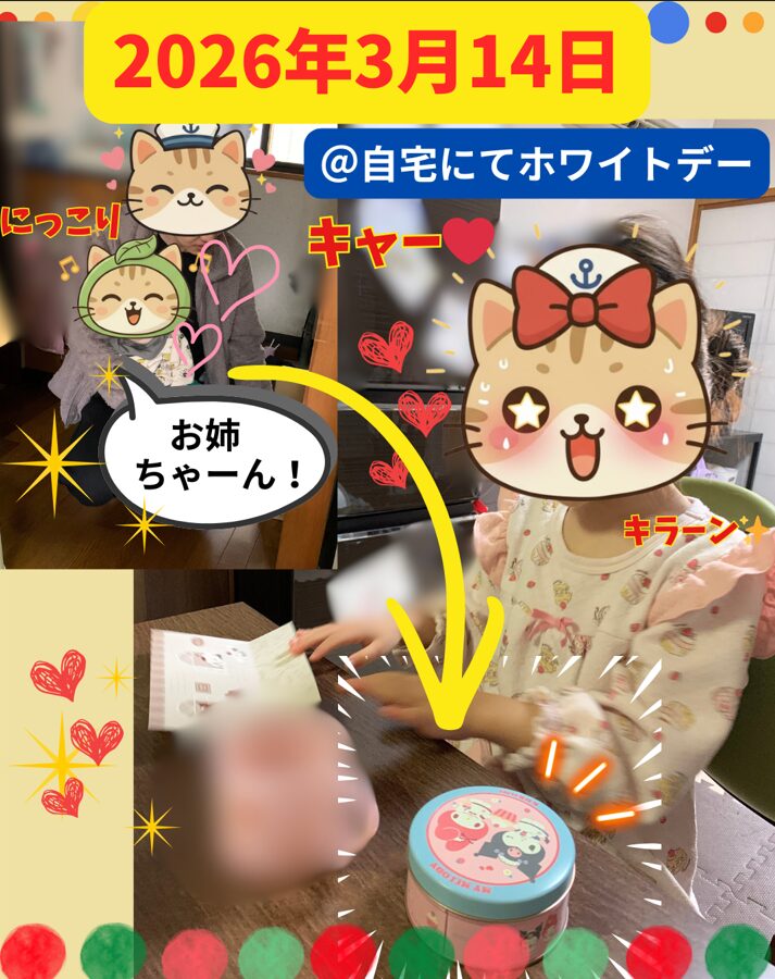 今日はホワイトデーだったので、朝起きた時に、お父さんにゃん太からにゃん子とお母さんにバレンタインデーに貰ったチョコレートのお返しをすることに🎁