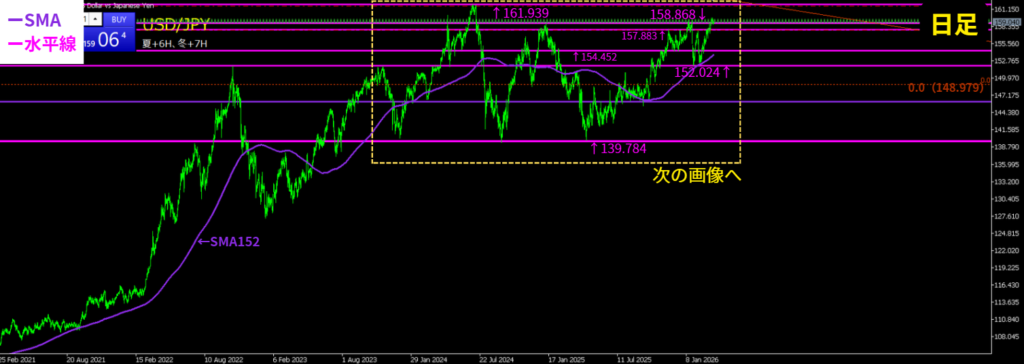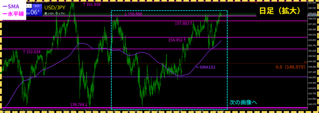 • 日足レンジが継続するなら、158.868 or 161.939付近で「転換点(大陰線)」が出る