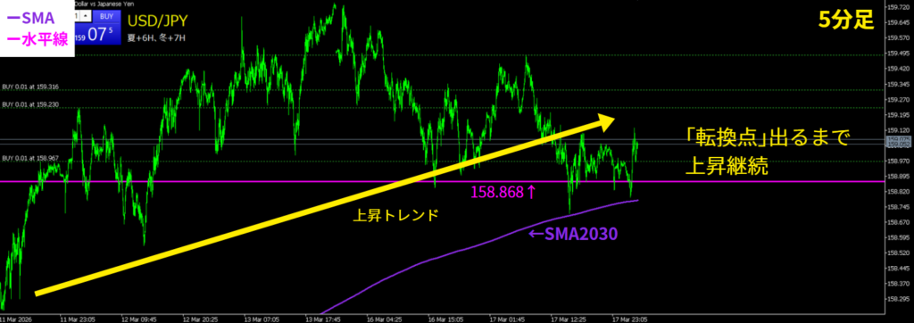 5分足で「転換点(大陰線)」が出たと勘違いして、ポジションをすぐに閉じて売りEntryをしたことは間違いだったので、反省📝まだ日足で「転換点」が出ていないから、買いは継続している!