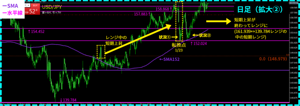 - 相場状況:レンジ(上161.939↔下139.784)中の短期レンジ(上158.868↔下152.024)