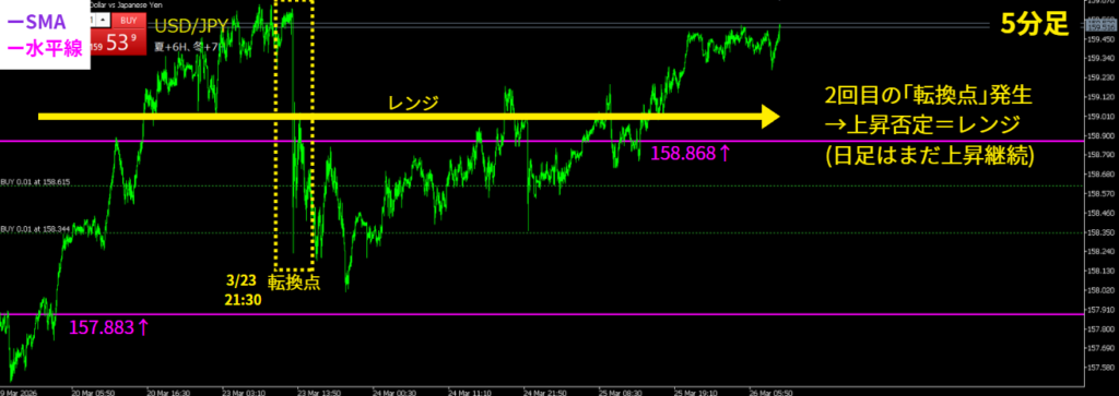 - 転換点:@3/19 21:30 大陰線(上昇終了)、@3/23 21:30 レンジ中の大陰線