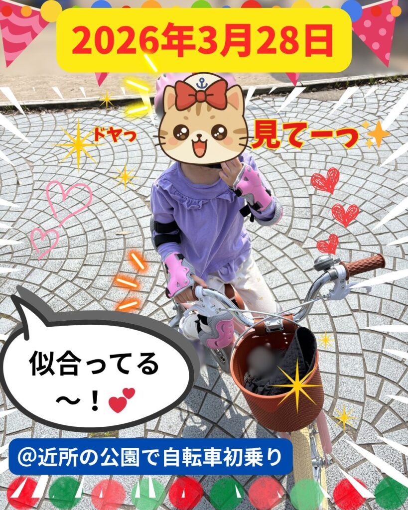 もう少し練習してもよかったかなあと思ったけど、お父さんがにゃん子の小さい自転車を後ろから押すときの中腰が姿勢的にきつすぎて、中腰のまま歩くのがしんどかったので、お父さん的にも今日はこれでいいかなということで、練習は切り上げることに🙌