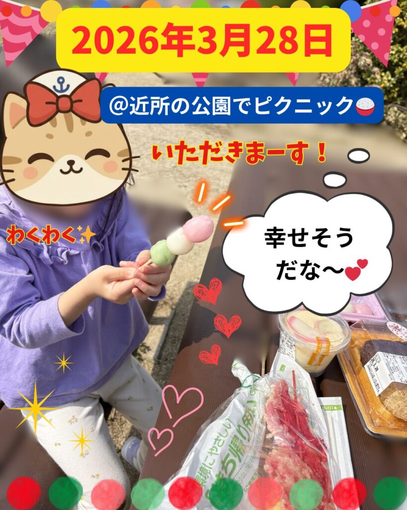 お父さんが「食べ物はこれいいんじゃない?」と言う提案をしたわけでは無いけど、にゃん子が自発的に「おはぎや3色団子を食べたい」と言って、まさしくお花見にぴったりなご飯ばかりをチョイスしていたので、そのおかげもあって、とても良いお花見ピクニックに🌸