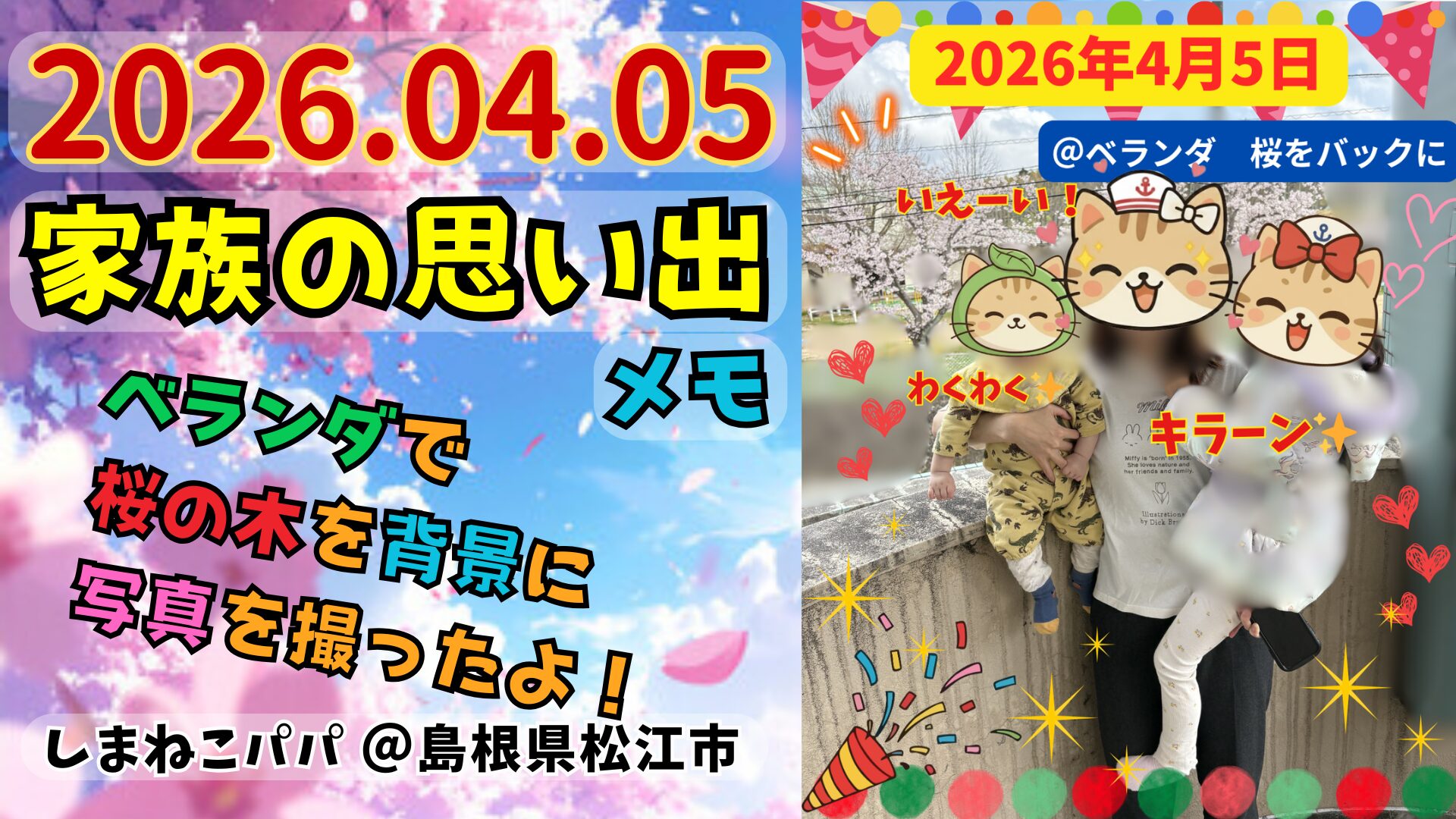 近所の桜並木がちょうど家から見えるので、最近は毎年その桜背景に子供と一緒に写真を撮っています!📷