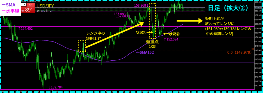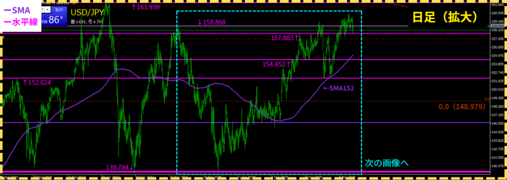 - 相場状況:レンジ(上161.939↔下139.784)中の短期レンジ(上158.868↔下152.024)