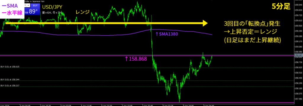 - 転換点:3回目 @4/8 7:30 レンジ中の大陰線