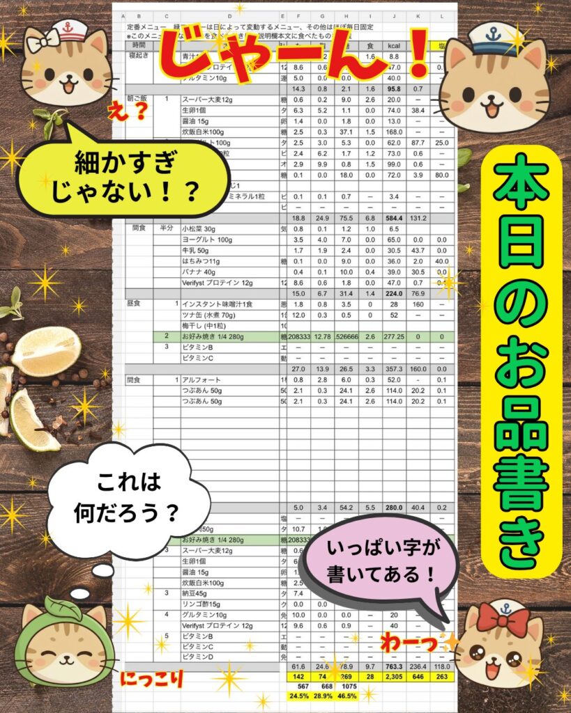 - PFCバランス=24.5%:28.9%:46.5%(脂質少し多い)