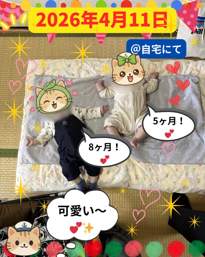 同い年で息子よりも三か月後に生まれた赤ちゃんだけど、体の大きさは同じぐらいで、並べてみると似た者同士、とてもかわいくて写真をいっぱい撮りました!