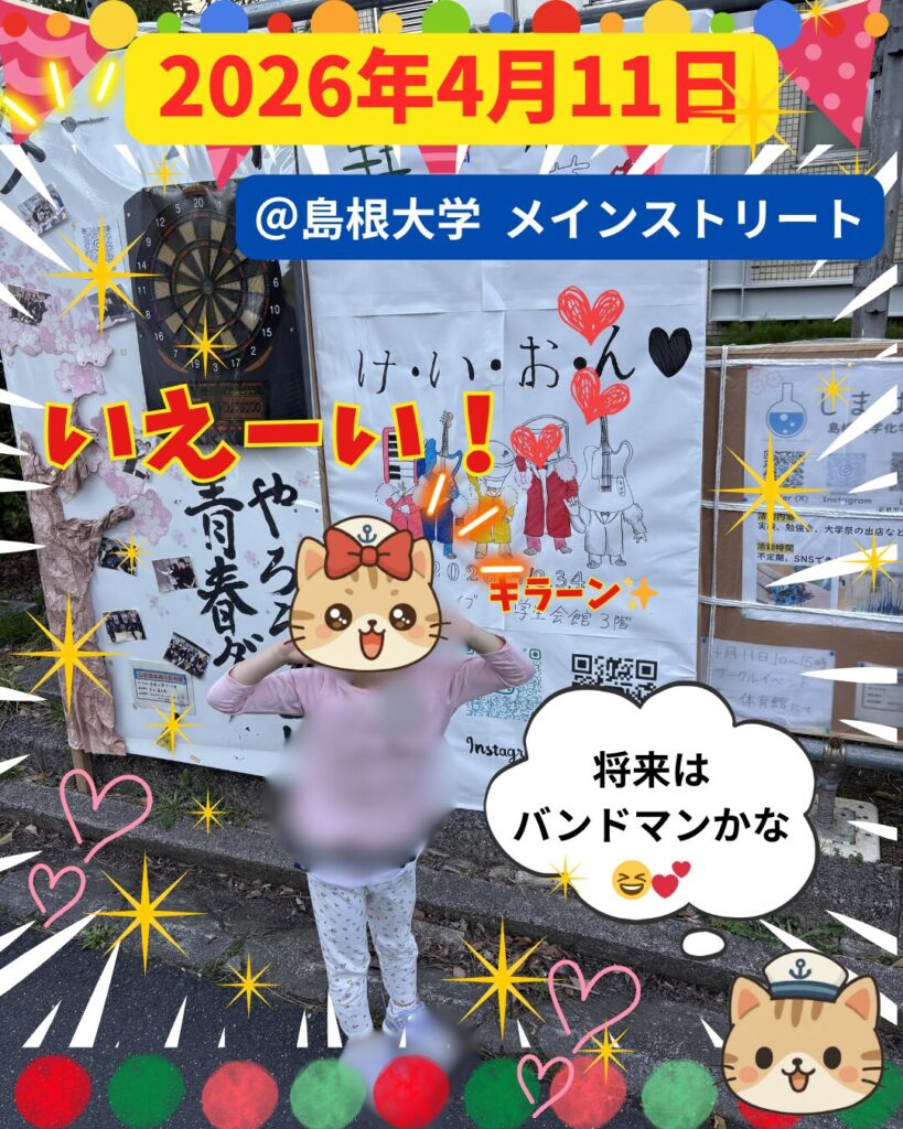 たまたまサークルや部活動の勧誘活動をしている時期で、メインストリートに活動の看板が立っていたので、軽音楽部の看板の前で写真を撮りました📸