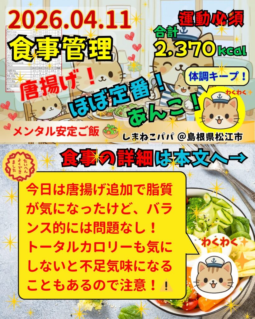 今日は唐揚げを結構食べたので、脂質のバランス的にはちょっと脂質が多くなるかなぁと思ったけど、全然できてみたときにそうでもなくて意外とカロリーは少なかったので、何を食べているかと言うことを意識しているかしてないかで、自分の体調と体つきはだいぶ変わり、そうだなぁと言うことを再認識した✨