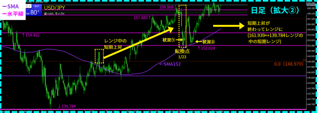 - 相場状況:レンジ(上161.939↔下139.784)中の短期レンジ(上158.868↔下152.024)