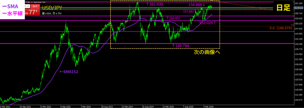 - 日足レンジ(上161.939↔下152.024)で、下から上に向かって値動きしている状況