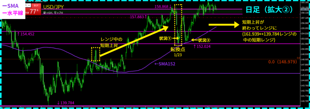 - 相場状況:レンジ(上161.939↔下139.784)中の短期レンジ(上158.868↔下152.024)