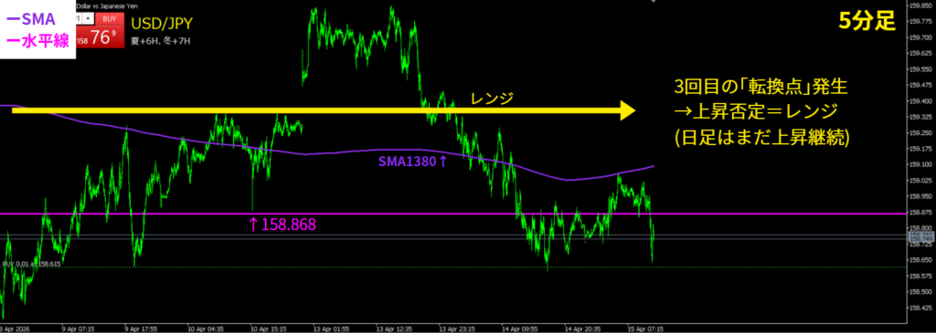 - 転換点:3回目 @4/8 7:30 レンジ中の大陰線