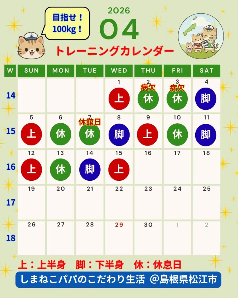 そうなるとせっかく楽しいトレーニングが楽しくなくなってしまうので、特にフォームは意識して、無理な姿勢でトレーニングをするようなことがないように引き続き注意して行こうと思う🌱
