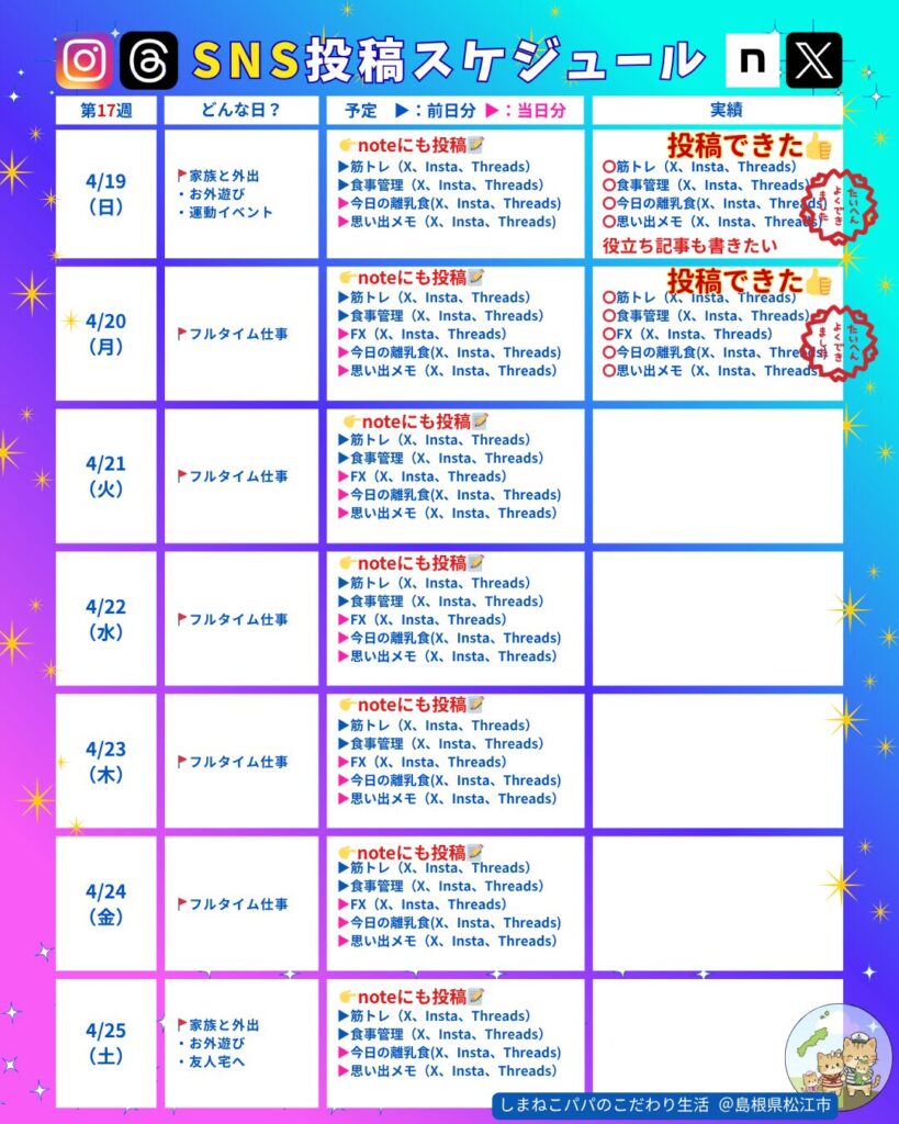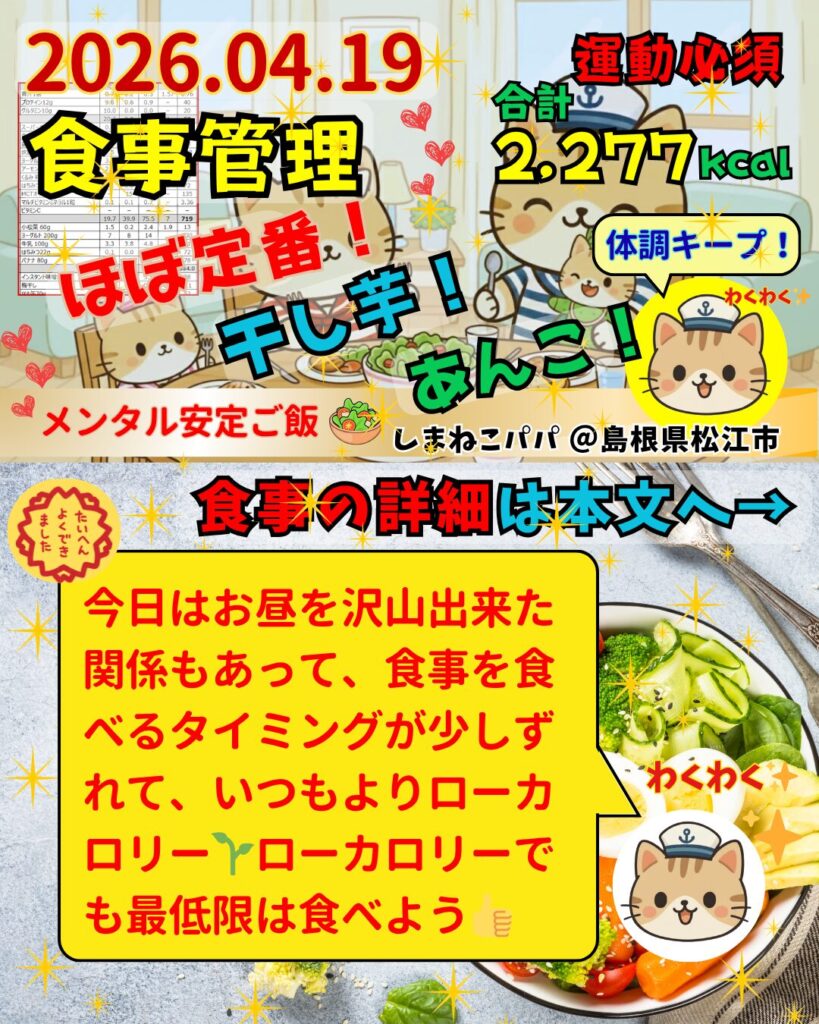 🐾しまねこパパの食事管理の記録📝2,277kcal🌱2026年4月19日