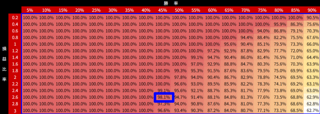 ▼進行中のトレードの破産確率(青枠が現状の確率)