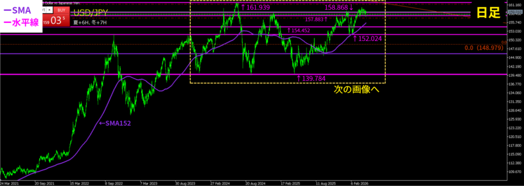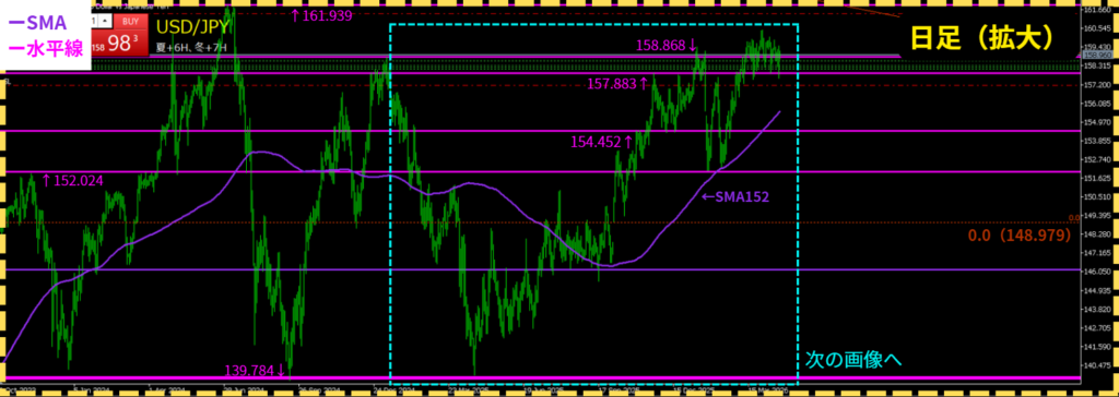 - 日足レンジ(上161.939↔下152.024)で、下から上に向かって値動きしている状況