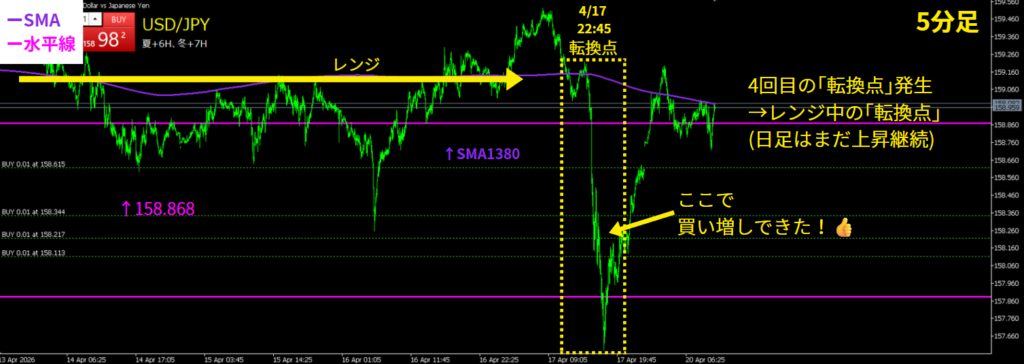 - 転換点:4回目 @4/17 21:45 レンジ中の大陰線
