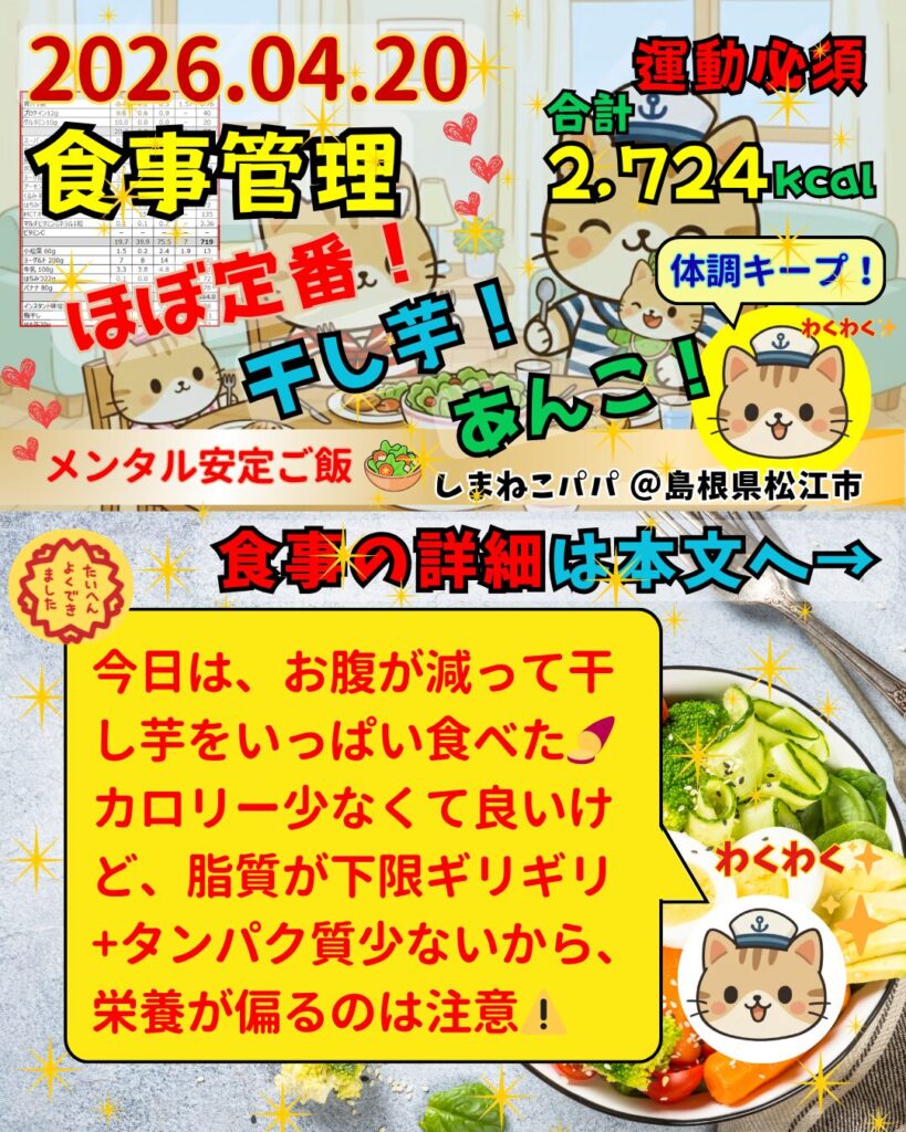 脂質が少なくて、糖質タンパク質もある程度とれながら、しかも食物繊維もとれるという最高の個人的に気に入っている食事だけど、さすがに干し芋ばかりでは栄養が偏ってしまった🌀