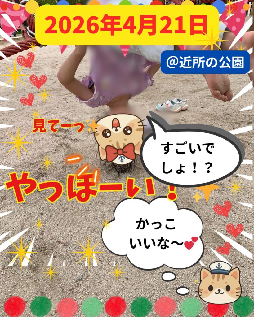 最近は、遊具とかもいろいろ安全面が考慮してあって、自分が子供の時に比べると危険なものはなくなってきたかなと思うし、公園自体もきれいな公園が増えてきたので、裸足で遊んで危険なものを踏むというのも、自分が子供の時に比べると少なくなってきたのかな~とか思いながら、自分が子供の時のように、娘も外でいっぱい元気で遊んでくれている姿を見てなんだか嬉しくなりました💕