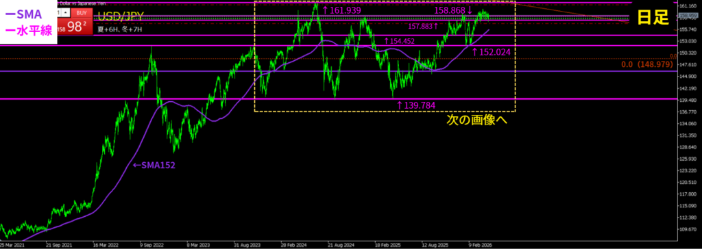 • 日足レンジ(上161.939↔下152.024)で、下から上に向かって値動きしている状況