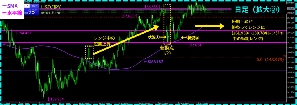 • 日足レンジが継続するなら、158.868 or 161.939付近で「転換点(大陰線)」が出る
