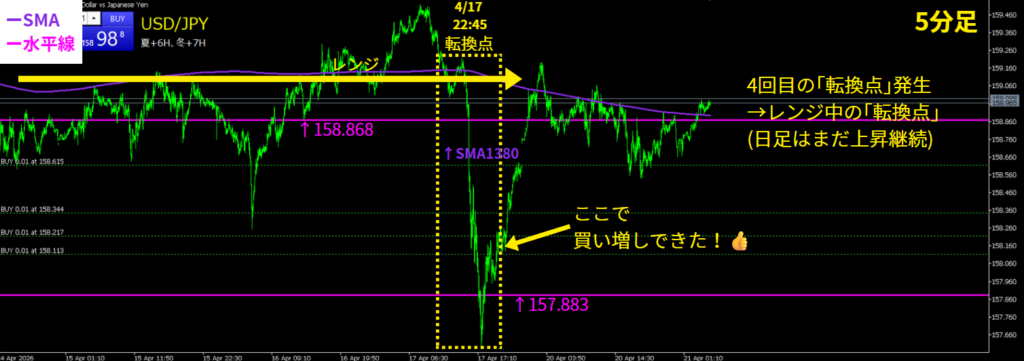 • 転換点:4回目 @4/17 21:45 レンジ中の大陰線