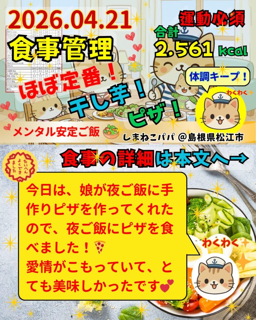 今日は夜ご飯にピザを食べた以外は、ほぼ定番メニュー!✨️