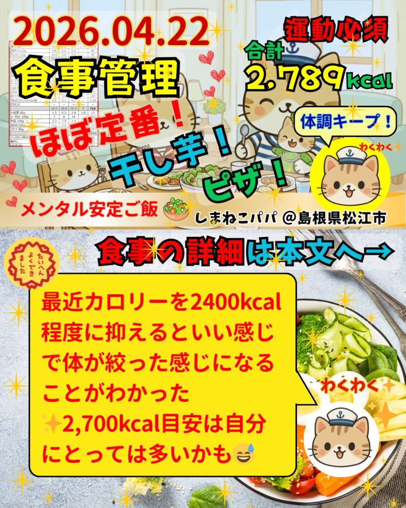 最近ハマっているむき栗や干し芋といった停止室で美味しく糖質と食物繊維が取れる食材のおかげで、健康管理はだいぶしやすくなっているけど、今日は息子から風邪をもらった感じで、自分も喉や鼻の調子が悪かったので、食事管理はできていても、体調があまり良くない感じ🌀