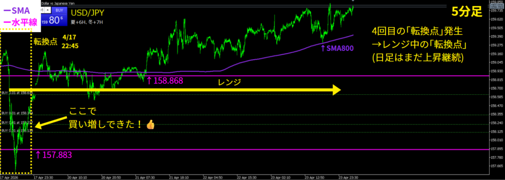 - 転換点:4回目 @4/17 21:45 レンジ中の大陰線