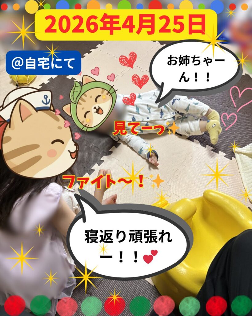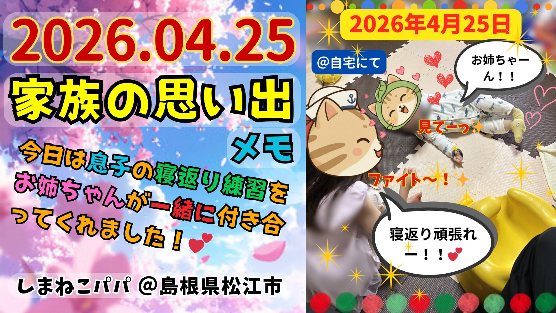 🐾しまねこパパの家族の思い出メモ📝今日は息子の寝返り練習をみんなで応援!📣あと少しでできそう!💕2026年4月25日