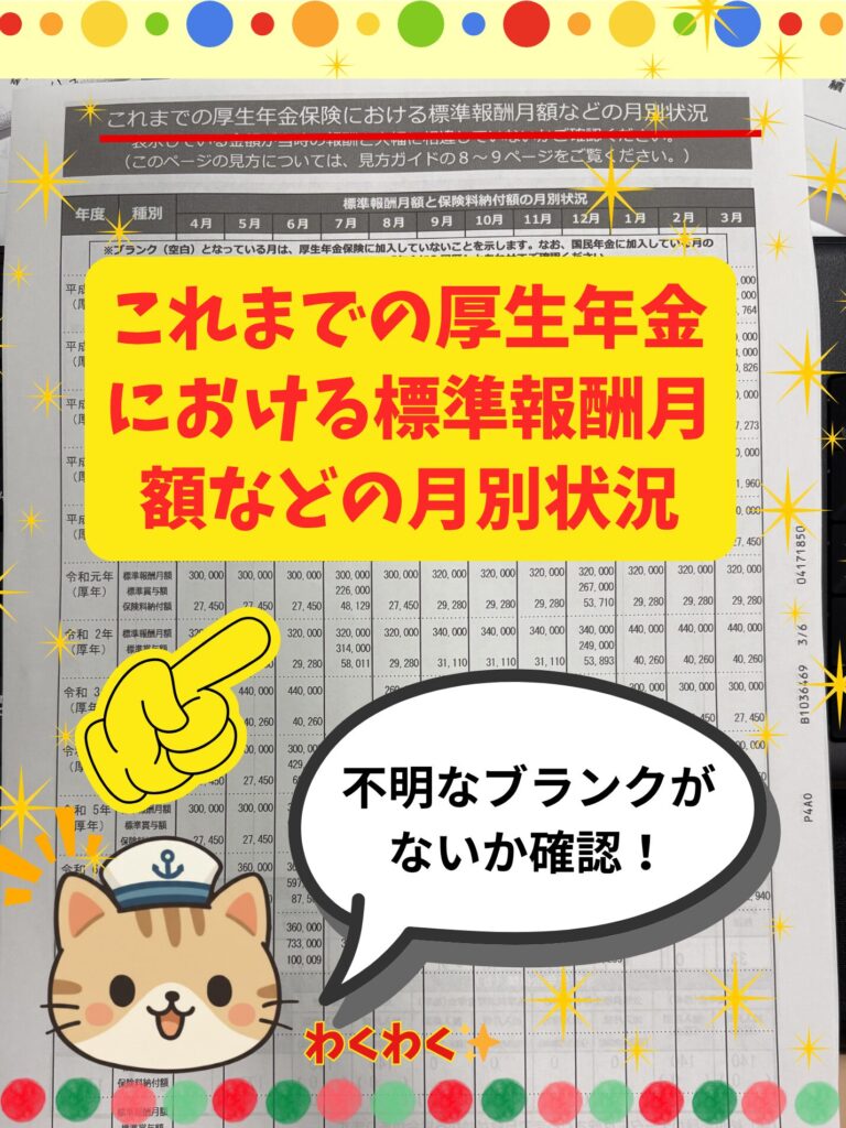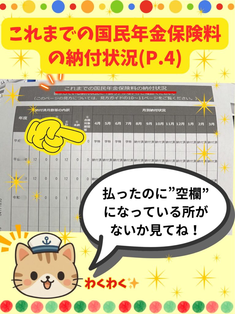 確認をする際は、二ペヌゞ目に曞かれおいる月数ず䞀緒に、四ペヌゞ目に「これたでの囜民幎金保険料の玍付状況」ずいう衚がありたすので、この衚も䞀緒に芋おください📊